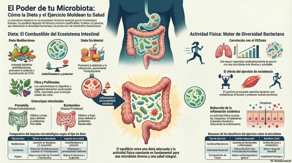 - Beneficios del ejercicio: La actividad física regular (especialmente la aeróbica y de resistencia) enriquece la diversidad del microbiota, mejora la relación entre bacterias beneficiosas y estimula la proliferación de especies que producen sustancias protectoras contra trastornos gastrointestinales.